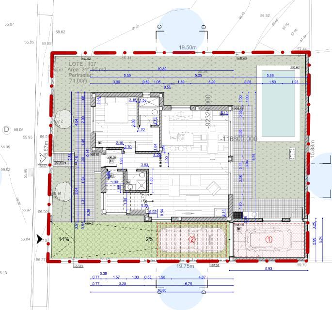 Propriedade | Moradia unifamiliar V4 em construção com dois pisos: O piso 0 é constituído por cozinha/sala, 1 suite, 1 casa de banho social e arrumos. O piso 1 apresenta 3 suites.